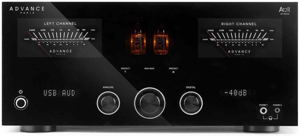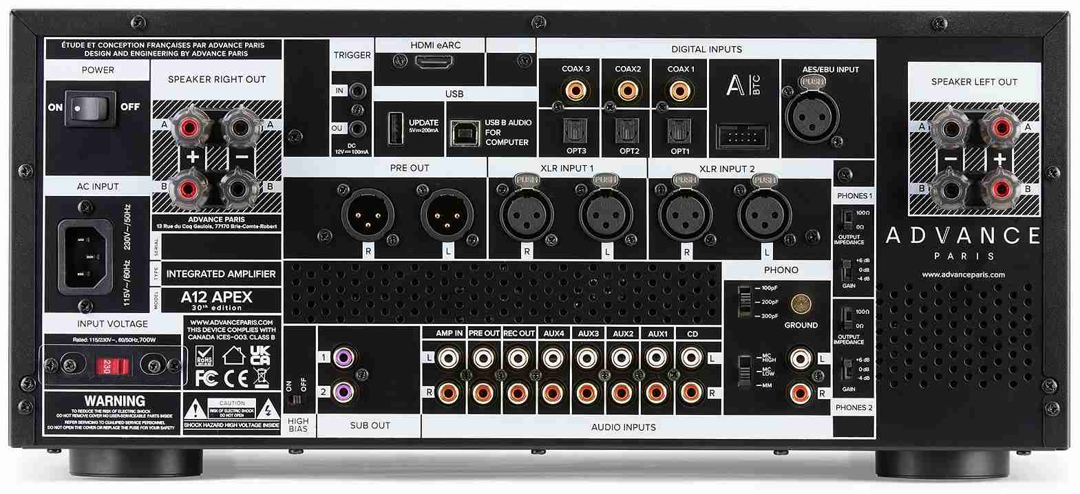 De Advance Paris A12 APEX is een luxe hybride geïntegreerde versterker die zowel de warmte van buizentechnologie als de brute controle en power van solide-state klasse AB versterking combineert. Het is het vlaggenschip van de APEX-lijn en richt zich op luisteraars die geen compromissen willen tussen muzikale emotie en technische performance. De voortrap maakt gebruik van vacuümbuizen (onder andere ECC81/12AT7) die de klank verrijken met karakter, terwijl de eindtrap volgens een hoogwaardig Dual-Mono principe is opgebouwd en in staat is om 2x 190 Watt aan vermogen te leveren bij 8 ohm (en zelfs 2x 292 Watt bij 4 ohm).Dankzij de hybride opbouw komt het beste van twee werelden samen: bij rustige luistervolumes werkt de HIGH-BIAS schakeling in effectief klasse A modus voor extra detail en klankrijkdom, terwijl bij intensief gebruik automatisch wordt overgeschakeld naar klasse AB om zelfs veeleisende luidsprekers overtuigend aan te sturen. De digitale sectie is eveneens topklasse: het nieuwe DAC-board is gebaseerd op de ESS9039 chip waarmee muziekopnames tot in de kleinste nuance worden weergegeven – de A12 APEX is dus ook ideaal geschikt voor moderne high-res muziekConnectiviteit maakt geen concessies: een HDMI eARC ingang zorgt voor naadloze integratie met televisies en home-cinema-opstellingen, terwijl talrijke analoge en digitale ingangen (waaronder USB-B, AES/EBU, optisch, coaxiaal), XLR-uitgangen, twee subwooferuitgangen (mono/stereo schakelbaar) en een uitgebreide phono-ingang (MM/MC) ervoor zorgen dat vrijwel elke bron eenvoudig kan worden aangesloten. Optioneel is er een bi-directionele Bluetooth-dongle beschikbaar waarmee draadloos streamen van muziek of koppelen met hoofdtelefoon mogelijk is.Kiezen voor de A12 APEX betekent investeren in een apparaat dat klaar is voor lange termijn. Hij is ontworpen voor wie écht muziek wil beleven, die in detail wil luisteren, zonder concessies. Vormgeving, techniek en flexibiliteit komen samen in een versterker die zowel in een high-end stereosetup als in een TV-centraal luistersysteem zijn plek verdient.