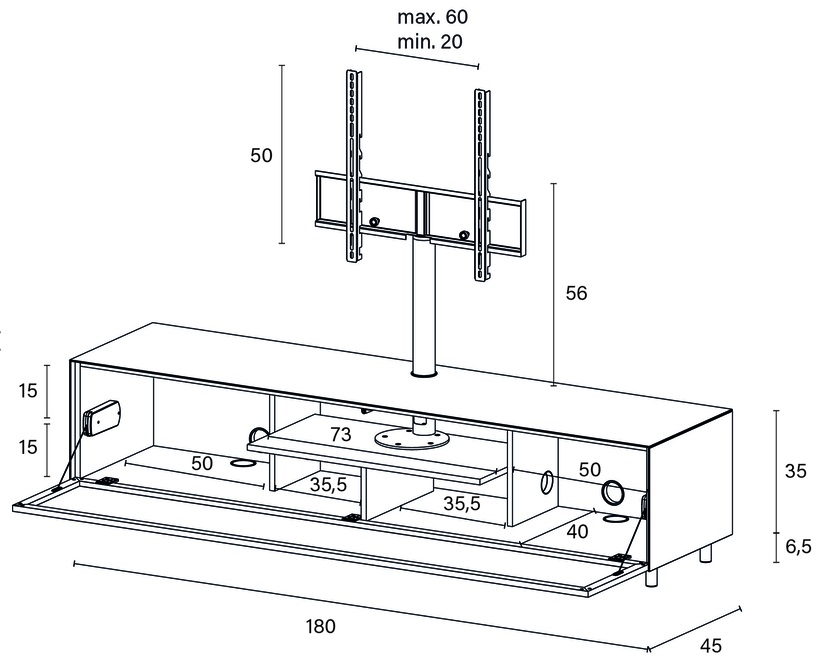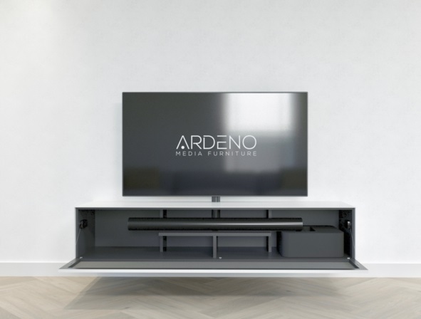 Het Ardeno Mika 180 tv meubel is de ideale oplossing voor iedereen die graag een opgeruimde woonkamer heeft zonder zichtbare soundbar, speakers, kabels en/of apparaten. Het Mika 180 tv meubel kan naar keuze op de vloer geplaats worden of aan de wand worden opgehangen. Voor vloerplaatsing zijn naar keuze meubelpootjes of design frame’s beschikbaar. Bij wandmontage wordt het meubel zwevend aan de muur gemonteerd.Robuust metaalEen Mika tv meubel beschikt over een fraai vormgegeven fijn geperforeerde stevig metalen klep in dezelfde kleur als het tv meubel. De perforatie is nauwelijks zichtbaar, wat een zeer fraaie afwerking oplevert, terwijl geluid perfect wordt doorgelaten wanneer er een soundbar op speakers in de kast worden geplaatst. Geniet van uitmuntend geluid, terwijl de luidsprekers onzichtbaar zijn.Soundbar systeem weg gewerktBijna elke soundbar en subwoofer kunnen achter de media klep van het Mika tv meubel verstopt worden, waaronder die van de bekende merken als Sonos, Yamaha, Bluesound en Loewe. Ook boekenplank speakers of compacte actieve draadloze speakers kunnen eenvoudig onzichtbaar worden opgesteld achter de media klep van de Mika tv meubel. Plaatsing televisieVoor het opstellen van de televisie maak jij de keuze. Je kunt je TV op zijn eigen voet op het meubel plaatsen, je kunt de televisie aan de speciale meegeleverde TV meubel beugel hangen boven de kast, waardoor de TV ook draaibaar is en tot slot kun je de TV boven het meubel aan de wand hangen. Voor elke gewenste oplossing kunnen de kabels netjes worden weg gewerkt, zodat ze helemaal uit het zicht onttrokken zijn.KenmerkenBreedte TV meubel 180 cmGehard veiligheidsglas bovenplaat en zijkantenMedia klep van geperforeerd metaalSoft open media klep met vlakke scharnierenTV beugel inclusiefWandophanging en moderne zwarte meubelpootjes inbegrepenStijlvolle onderstel design frames voor vloerplaatsing optioneel leverbaar