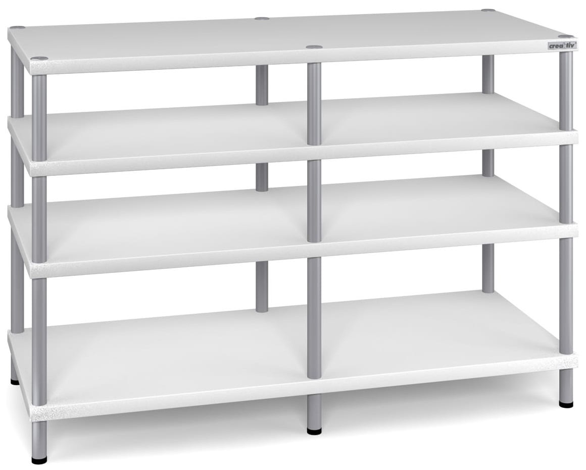 Creaktiv Trend Line 2-4 audio meubelAudio Rack4 niveaus, dubbele breedteBreedte 1160 mm (buitenmaat), 2x 515 mm binnenmaatDiepte 480 mm (buitenmaat)Schaphoogte naar keuze 170 of 250 mm per niveau te kiezen (standaard 1x 250 en 2x 170)Creaktiv Trend LineDe Trend Line racks vormen de betaalbare middenklasse van Creaktiv. Met een plaatdikte van 28mm en een ijzersterke toplaag van Melamine. In enkele, dubbele en driedubbele breedtes en standaard uitbreidbaar met extra verdiepingen, bieden deze racks plaats aan iedere installatie, van klein tot groot. Voor de Trend 1, 2 en 3 kan optioneel gekozen worden uit verschillende voeten. Draagvermogen van de plateaus bedraagt 60kg, de buizen hebben een diameter van 35mm en kunnen in zwart of zilver geleverd worden. De standaard buislengte is 250mm en 170mm. Zie de accessoirelijst voor alle mogelijke opties.