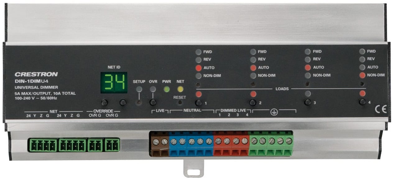 De Crestron DIN-1DIMU4 is een 4-kanaals universele dimmer op basis van één voeding met DIN-railmontage. Vier kanalen voor fase aan- of afsnij dimming met automatische belastingdetectie. 120 tot 240 Volt 50/60 Hz voor elektronische en magnetische laagspannings-, gloeilamp-, neon-/koude kathode-, 2-draads dimbare fluorescentie- en niet-dimbare verlichtingsbelastingen tot 5A per kanaal, 10A totaal.Automatische belastingdetectieElk kanaal van de DIN-1DIMU4 kan automatisch het dimbare belastingstype detecteren dat erop is aangesloten en de juiste bedrijfsmodus selecteren om die belasting te regelen. De omgekeerde fasemodus (trailing edge) ondersteunt gloeilampen en elektronische laagspanningsbelastingstypen, terwijl de voorwaartse fasemodus (leading edge) magnetische laagspannings-, neon- en andere inductieve belastingstypen verwerkt. Er kan ook een niet-dimmodus worden geselecteerd voor het schakelen van niet-dimbare verlichtingsarmaturen. Elk kanaal kan voor elke modus worden ingesteld, waardoor één dimmermodule elke combinatie van verlichtingstypes op vier afzonderlijk bestuurde circuits kan aansturen.Fasesynchrone detectiecircuitsDe gepatenteerde Zero Cross Filter-technologie biedt superieure immuniteit voor ruis op de elektriciteitsleiding, vermindert het flikkeren van de lamp en compenseert schommelingen in de lijnspanning en -frequentie.KortsluitbeveiligingIngebouwde OCP (overstroombeveiliging) voorkomt uitval van de DIN-1DIMU4 veroorzaakt door overmatige belasting of onjuiste bedrading van de uitgangen.Primair luchtspleetrelaisWanneer alle vier de kanalen volledig zijn uitgeschakeld, opent het interne hoofdrelais automatisch en zorgt voor luchtspleetisolatie om veilig onderhoud en vervangen van lampen op alle vier de gecontroleerde circuits mogelijk te maken.Invoer negerenEr is een override-ingang voorzien waarmee een externe contactsluiting tijdelijk het programma van het besturingssysteem kan opheffen en elke kanaaluitgang op het vooraf ingestelde override-niveau kan zetten. Niveaus kunnen lokaal worden aangepast en opgeslagen vanaf het voorpaneel of op afstand via software.DIN-rail installatieDe DIN-1DIMU4 is ontworpen om op een standaard DIN-rail te klikken voor installatie in een wandmontagebehuizing. De bedradingsaansluitingen worden gemaakt met behulp van schroefklemmen die langs de onderkant zijn geplaatst en duidelijk toegankelijk zijn vanaf de voorkant voor eenvoudige installatie en onderhoud. Alle instelknoppen en indicatoren bevinden zich op het centrale voorpaneel. Bij installatie in een behuizing met uitsparingen van 45 mm blijft het voorpaneel van de DIN-1DIMU4 toegankelijk terwijl de aansluitingen verborgen zijn.Cresnet bekabelde communicatieDe DIN-1DIMU4 communiceert met een Crestron-besturingssysteem via het Cresnet-controlenetwerk. Op de DIN-1DIMU4 is een paar Cresnet-poorten aanwezig, waardoor het eenvoudig doorlussen van verschillende automatiseringsbesturingsmodules uit de DIN Rail-serie mogelijk is.