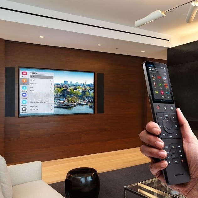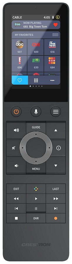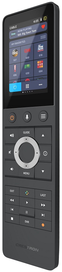 De Crestron TSR-310-B is een handheld afstandsbediening met touchscreen, in de uitvoering zwart. Een elegante, ergonomische en robuuste afstandsbediening met een 76 mm kleurentouchscreen, verlichte knoppen, spraakbediening en verbeterde draadloze Wi-Fi-communicatie. Bewegingsdetectie activeert de afstandsbediening wanneer deze wordt vastgepakt, zodat deze altijd klaar is voor gebruik. De TSR-310 kan ook worden gecombineerd met Crestron Home OS en andere Crestron-bedieningsoplossingen voor volledige controle over audio, video, verlichting, zonwering en andere voorzieningen.Touchscreenknoppen met achtergrondverlichtingTouchscreenknoppen met achtergrondverlichting bieden toegang tot alles wat u nodig hebt om tv te kijken, naar muziek te luisteren, door schermmenu’s te navigeren en door media te bladeren. Elke knop is gelabeld voor eenvoudige bediening. Het metalen vijfwegs-duimpad maakt directionele navigatie mogelijk bij normaal gebruik en verandert van kleur wanneer het in de vierkleurenmodus staat om toegang te geven tot de groene, blauwe, rode en gele optieknoppen. Deze gekleurde knoppen worden gebruikt om speciale functies te openen.Elke knop op de TSR-310 is volledig programmeerbaar voor het aanpassen van het audiovolume en het wisselen van kanalen, het bladeren door een mediabibliotheek of programmagids, het bedienen van een DVR of dvd-speler, of het bedienen van een pan/tilt-camera.Touchscreen met Smart Graphics-technologieDe TSR-310 beschikt over een capacitief touchscreen met hoge resolutie en hoog contrast, waarmee u een breed scala aan apparaten volledig kunt aanpassen. Crestron Smart Graphics®-technologie zorgt voor een intuïtieve touchscreen-ervaring met vloeiende, gebaargestuurde bediening, kinetische effecten, geanimeerde feedback, rijke metadata, ingebedde apps en widgets, en gepersonaliseerde thema’s.