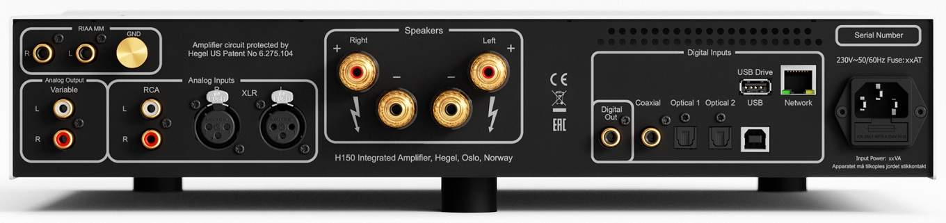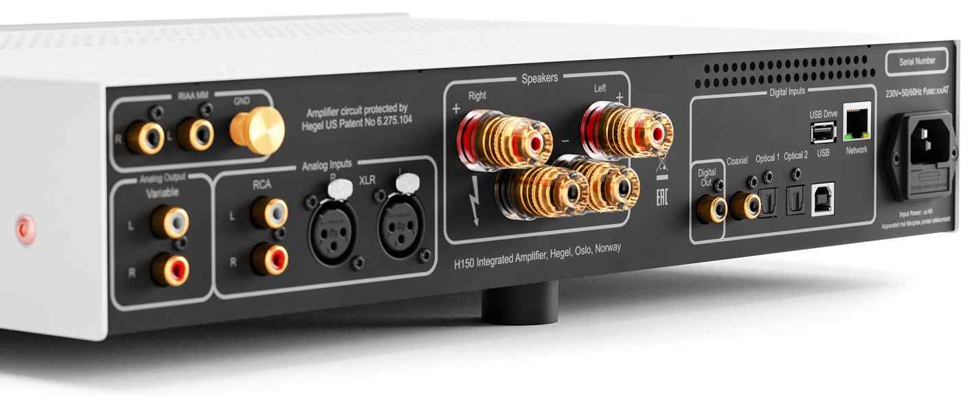 Voor analoge bronnen beschikt de H150 over een MM-phono-ingang voor draaitafels, evenals een gebalanceerde XLR-ingang en een ongebalanceerde RCA-ingang. Een variabele lijnuitgang biedt de mogelijkheid om een subwoofer of een externe versterker aan te sluiten.