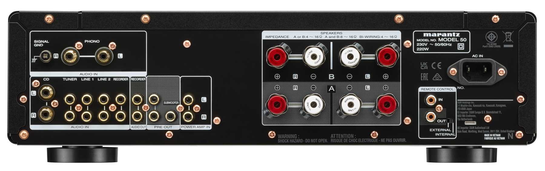 De Marantz Model 50 is een geïntegreerde premium stereo versterker met 70 Watt vermogen per kanaal en heeft de legendarische HDAM technology van Marantz aan boord. Model 50 is de ideale geïntegreerde versterker. Met 70 watt per kanaal aan uniek Marantz Current Feedback-vermogen en HDAM SA-3-schakelingen stuurt Model 50 luidsprekers volledig gecontroleerd aan.Warm, vol en ruimtelijk geluid. Elegant om te zien. De Marantz 50-serie biedt de perfecte balans tussen tijdloos en modern. Het product van 70 jaar aan evolutie.Hoog vermogen en toch nauwkeurig. Met een nauwkeurig ontworpen klasse-A/B-versterker stuurt Model 50 je luidsprekers met gezag aan en hoor je details waarvan je niet wist dat ze bestonden.Analoge puurheid en eenvoud. Analoog stond voorop bij het ontwerp van Model 50. Doordat er bewust niet voor digitaal geluid is gekozen, is de bediening volledig intuïtief en is er geen risico op storing door complexe digitale schakelingen.Uitgelezen stijl. Model 50 is zo ontworpen dat hij in alle opzichten modern en tegelijkertijd tijdloos is. Kenmerkende ontwerpaspecten zoals symmetrie, een warme uitstraling en tactiele feedback verleggen de grenzen van het ontwerp van audioapparatuur en vormen een eerbetoon aan eerdere iconische producten.