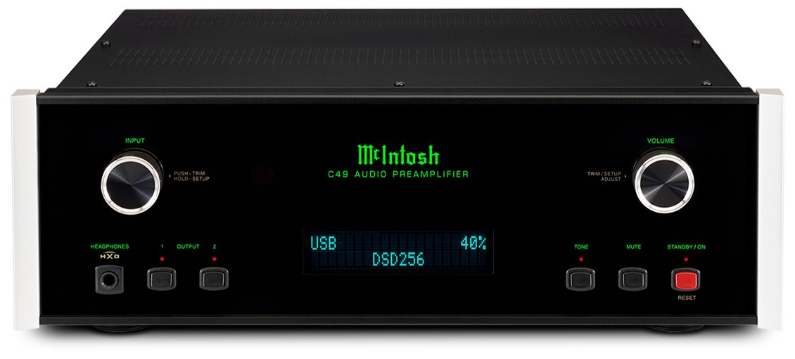 Wees voorbereid op toekomstige digitale muziektechnologieën met de McIntosh C49 voorversterker. De C49 is voorzien van de DA1 Digital Audio DAC Module, die kan worden vervangen door nieuwe modules wanneer nieuwe digitale audiotechnologieën worden ontwikkeld. Op deze manier kun je jouw uC49 up-to-date houden met digitale muziekformaten nu en in de toekomst.De C49 wordt geleverd met een veelheid aan ingangen. Voor analoog heeft het 2 gebalanceerde en 3 ongebalanceerde ingangen, samen met 2 phono-ingangen (MM en MC) voor het aansluiten van draaitafels. Aan de digitale kant heeft het 6 ingangen die zijn ondergebracht in de DA1-module. De ingangen zijn: 2 coaxiaal, 2 optisch, 1 USB en 1 gepatenteerde MCT (voor gebruik met de MCT-serie SACD / CD-transporten). De DA1 wordt aangedreven door een 8-kanaals 32-bits digitaal-naar-analoogomzetter (DAC) die wordt gebruikt in de Quad-gebalanceerde modus. Deze ondersteunt tot DSD256 en DXD 384kHz voor het afspelen van audio met hoge resolutie. In totaal heeft de C49 13 ingangen en kan elke gebruiker gebruiksvriendelijke namen gebruiken om de systeeminstellingen en besturing te vereenvoudigen.Voor aansluiting op je eindversterker en de rest van je hifi installatie heeft de C49 twee gebalanceerde variabele uitgangen, twee ongebalanceerde variabele uitgangen en één ongebalanceerde vaste uitgang. De uitgangen zijn ontworpen voor eenvoudig gebruik bij het dubbel versterken van je luidsprekers. Je audiobronnen kunnen worden afgesteld via de bas- en treble-toonregeling. De C49 kan naadloos worden geïntegreerd in je thuisbioscoopsysteem via Home Theater Pass Through. Power Control-poorten maken het eenvoudig inschakelen / uitschakelen van andere aangesloten McIntosh-componenten mogelijk, terwijl de datapoorten opdrachten voor afstandsbediening kunnen verzenden naar aangesloten broncomponenten. De High Drive hoofdtelefoonversterker met Headphone Crossfeed Director (HXD) is ook inbegrepen.De C49 wordt geleverd met klassieke McIntosh-ontwerpelementen zoals een voorpaneel van zwart glas, een verlicht logo en aluminium regelaars. Koppel hem met een verscheidenheid aan versterkers, draaitafels, CD-spelers, tuners, luidsprekers, stroomregelaars en kamercorrectie-apparaten om een compleet audiosysteem voor thuis te maken.