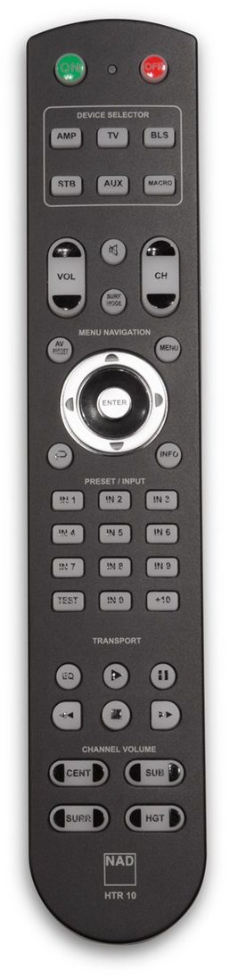 De NAD HTR 10 afstandsbediening is ontworpen om te voldoen aan de huidige en toekomstige behoeften van home-entertainment met belangrijke functies zoals doorvoervolume, IR-learning, macro, directe toegang tot bronnen en kanaalvolumeregeling. Het cursorgedeelte van de HTR 10 is ontworpen met omliggende knoppen die een effectievere navigatie mogelijk maken. Als antwoord op de vraag naar kanaalaanpassing binnen een Atmos-theaterontwerp is een knop toegevoegd waarmee het volume van de hoogtekanalen kan worden aangepast.Bedient tot 5 apparatenVoorgeprogrammeerd met alle NAD afstandsbedieningcommando’sLeerfunctie – leert tot 220 commando’sMacrobewerkingen – programmeert tot 48 macro’s met elk tot 64 commando’sPunch Through Operations – biedt eenvoudige toegang tot veelgebruikte functies zonder een apparaat opnieuw te hoeven selecterenAchtergrondverlichting (met instelbare time-out) – voor eenvoudige bediening bij weinig lichtKan IR-signalen opwekken met een draaggolffrequentie tot 500 kHz