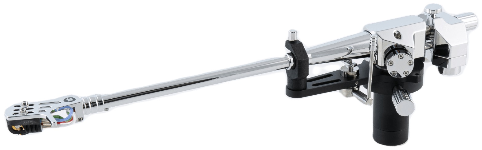Na jarenlang gewerkt te hebben met externe producenten voor de beste toonarm voor de betere Transrotor modellen, werd besloten ook zelf een high-end toonarm te ontwerpen en produceren. Transrotor beschikte hiervoor ruimschoots aan praktische ervaring met de beste toonarmen ter wereld, relevante kennis en toegang tot de modernste productiemethoden. Het doel werd topprestatie, gebruiksgemak en eenvoudige installatie. Daarmee werd de oa. de 12 inch Transrotor TRA 9 toonarm geboren. Met behulp van zijn fijne mechanica om geen enkele stempel op muziek te drukken en zelfs extreem hoogwaardige pickups in staat te stellen hun volledige sonische potentieel te ontwikkelen. Het creëren van een resonantie-vrije toonarmbuis is van doorslaggevend belang. Daarom koos het ontwerpteam van Transrotor voor een tweedelige oplossing met een taps toelopend deel dat is verbonden met het lagerblok. In eerste instantie was het de bedoeling om een ??tweede buis in te brengen en de headshell aan de andere kant te bevestigen. Als de buizen elkaar overlappen, zouden ze elkaar onderling verzwakken. Er was echter geen standaardbuis met de extreem nauwe toleranties die voor deze toepassing vereist zijn, op de markt te vinden. Daarom is de voorste toonarmbuis cnc-gefreesd uit een massief stuk aluminium.Maar het zijn niet alleen de verschillende afmetingen van de twee buizen die resonantie minimaliseren. De ervaring van Transrotor met het bouwen van draaitafels maakte het mogelijk om verschillende aluminiumlegeringen zo te combineren dat ze optimaal gedempt worden. Maar bij een toonarm gaat het niet alleen om trillingsbeheersing, het gaat er ook om deze zo snel mogelijk af te leiden. Daarom werd het idee om de twee buizen te verlijmen afgewezen. Dankzij de zeer lage toleranties raken de twee buizen elkaar over een groot oppervlak en hoeven ze alleen nog maar vastgeschroefd te worden.Het massieve lagerblok is bovenop volledig plat ontworpen. Met deze functie kun je eenvoudig de horizontale uitlijning van de arm controleren door tijdens het afstellen een waterpas te plaatsen. Voor een gevoelige hoogteverstelling worden twee draadstangen gebruikt. Voor eenvoudige hoogteverstelling wordt een parallellogram van plexiglas meegeleverd met de toonarm en twee draadstangen die in de bijbehorende draadbussen worden geschroefd. Met de twee stangen kan de arm uiterst gevoelig op en neer worden bewogen.Het contragewicht is fijn verstelbaar door middel van een centraal geplaatste schroef. De lagerkracht kan tot op de tweede decimaal nauwkeurig worden ingesteld. De verchroomde messing gewichten kunnen indien nodig worden vervangen door exemplaren met verschillende gewichten. Antislipkracht wordt magnetisch gegenereerd en is fijn instelbaar. De headshell kan worden gedraaid voor azimutaanpassing.Extreem lage losbreekkrachten en zeer weinig speling zijn bepalend voor een toonarmlager. Hierdoor worden door Transrotor hoogwaardige Japanse stalen lagers gebruikt voor horizontale geleiding en keramische lagers voor verticale geleiding. Beide lagers worden tegen elkaar geschoord om ongewenste speling te voorkomen.