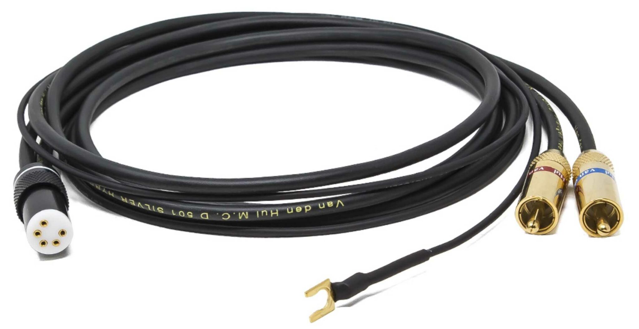 De Van den Hul D-501 Silver Hybrid is een speciale versie van de D-501 Hybrid. Het belangrijkste verschil met de D-501 Hybrid is dat de beide signaallijnen zijn gemaakt van de hoogste kwaliteit Matched Crystal Silver.Deze matzwarte Hullilflex gebalanceerde kabel met mantel is ontworpen als toonarmkabel. Zeer flexibel en met extreem goede elektrische eigenschappen. De D-501 Silver Hybrid is een kabel met een zeer hoge afschermingsfactor. Sonisch gezien de beste phono kabel.De 2 signaallijnen zijn elk gemaakt van 19 x 0,1 mm. hoogste kwaliteit Matched Crystal Silver-strengen. De weerstand per signaaldraad is 11,9 Ohm/100 meter.De capaciteit tussen de 2 signaalkabels is een zeer lage 58 pF/meter.De hybride afscherming bestaat uit een dicht en zeer puur zilver gecoat hoogwaardig Matched Crystal (MC) OFC 72 x 0,1 mm. draadspiraal met daaronder een Linear Structured Carbon (LSC) verzadigde geleidende ondermantel.De weerstand van de afscherming is 3,2 Ohm/100 meter.De zeer flexibele zwarte buitenmantel is gemaakt van migratievrij Hulliflex om chemische aantasting gedurende een lange periode te voorkomen.De uitwendige kabeldiameter bedraagt 4,0 mm.Toonarmkabel in de configuratie TAC 180 (SME connector straight) – 2x RCA male